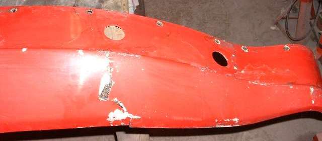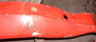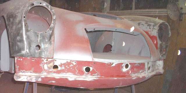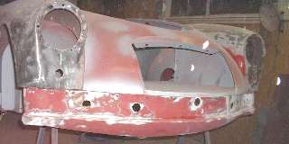 I was slowing down a bit here, sanding a lot of paint off the doors and wings (fenders to us yanks). Before removing the front fenders again, it was a good time to repair the fiberglass front valance panel.
