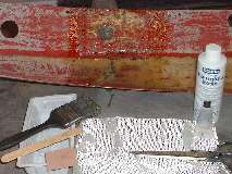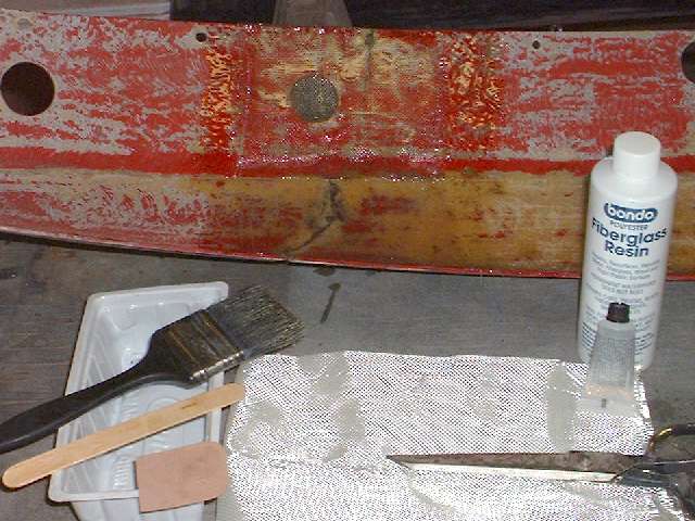 The fiberglass repair kit is available at almost any auto parts store and many large discount department stores. For the repair in back I prepare two pieces of fiberglass cloth, easily cut with scissors, large enough to extend at least 2-inches beyond the area to be repaired (above center). The resin and hardener are mixed in 40 to 1 ratio. For small amounts that means 14 drops hardener for each ounce of liquid resin. Instructions say to dip the cloth and smooth it onto the surface with a plastic spatula. This is a messy process perhaps appropriate for patching a larger hole with outside access only. For solid flat surfaces there is an easier (and cleaner) way. I use a 2-inch brush to paint resin onto the surface to be repaired, then lay the cloth onto the surface and paint over it with more resin, saturating the cloth in the process. I then add the second layer of cloth and repeat with brush to saturate. This is quick and easy, and the cloth can be pushed around with the tip of the brush to conform to the surface, including getting into some pretty tight corners and intricate contours (results above center). Any number of layers of cloth can be applied this way to build up a panel with desired thickness and strength.