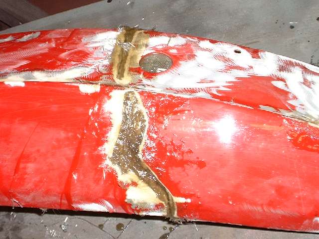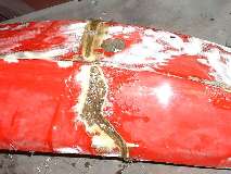 Instructions say you can sand the stuff after 90 minutes. I gave it an hour to set up (solid but still slightly sticky), then turned the part over to work on the front side. For filling the deep grooves instructions call for use of random fiber mat, which is a different material not included in this kit. Since this repair is not very large in volume, I cut about half a square food of cloth into shreds using scissors. I cut at angles to the cloth weave in 1/8 to 1/4-inch increments in various directions to produce small snippets of cloth and lots of short fibers. I then mixed the resin, brushed it into the crevice, sprinkled the dry cloth fibers on top, and then brushed that material into the crevice using more resin on the brush. I also used a few long narrow strips of cloth running the length of the crevice in alternating layers within the random fiber. I used the tip of the brush to pack the fibers into the joint displacing some of the resin. I continued this process until the joint was completely packed full of fiberglass built up a little above the intended finished surface and completely saturated with the plastic resin (no air bubbles), then let it set to cure solid (see above right).