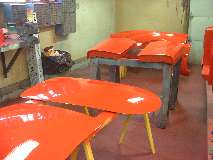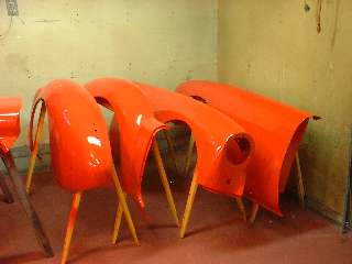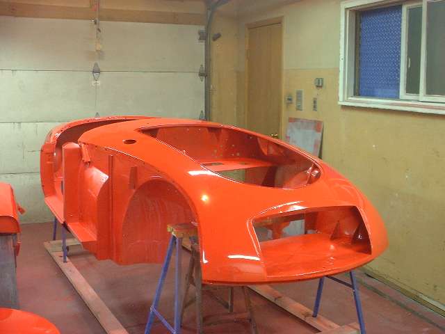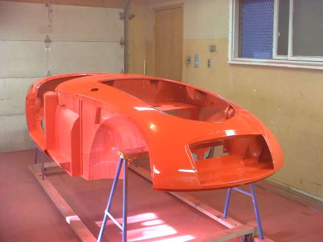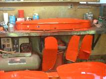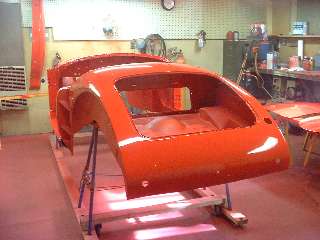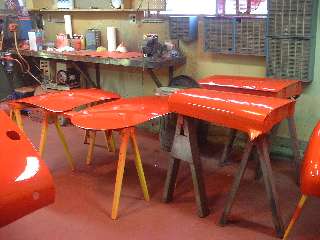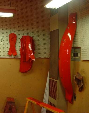 Ah, finally a good day for finish painting, and good timing too. Warm and bight sun from early morning throughout the day, rising temperatures and dropping humidity. Since this is not a big job, I wait until mid afternoon for the driest conditions. Then in a couple of hours, like magic, there appears a sea or red in my garage, and I hope the last spray job. Tomorrow on to fine grit wet sanding and polishing. There is progressively more adrenalin flowing these days as reassembly time is fast approaching. You might not believe it from here, but I WILL have it completely finished and on the road within two weeks. Stay tuned. .... (10 June 08)