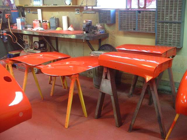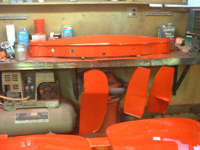 I started by painting the top side of the main body, and that seemed to come out very nice, especially after a second coat. Then I pushed the body dolly off the front corner of the room and started painting loose panels in the opposite corner. Front fenders first, then the rear fenders, each one set up on a separate saw horse (some of those borrowed), then push each finished unit back toward the corner of the room. I was doing okay until I fat fingered something and dropped a half painted rear fender on the floor. Doh! Oh well, just a little more wet sanding and another coat of paint will fix that (tomorrow). Then I did the doors (2nd coat), and began seeing a few small spits of water droplets on the paint, nothing to worry about yet, as it would be wet sanded one more time (at least). The bonnet went about the same, pretty nice results. When I was doing the deck lid the sprayer began spitting unreasonable amounts of water in a few places, but I wasn't going to stop this close to being finished. With a little paint left in the gun I did the valance panel (second coat), then 5 of the 6 splash panels (2nd coat) and quit when it ran empty, not wanting to mix up one ounce of paint for a single part that could wait till later. By early evening everything was red, no more gray, and it was time to clean the gun and take pictures.