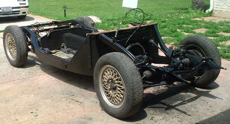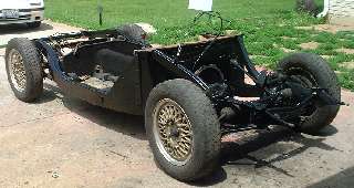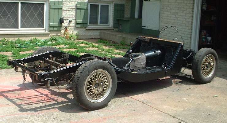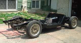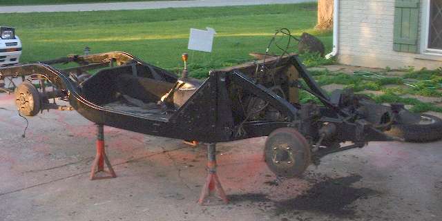 Meanwhile to stay productive I rolled out the chassis, dropped the exhaust system, pulled the engine, ripped out most of the carpet, and I'm cleaning and repainting part of the frame that is accessible only while the body is off and carpet is out. Get that picture quick before the sun drops. The radiator also went into the shop for inspection (a few days earlier) and will have the 20 year old core replaced (bummer, but only money not my time). .... (6 June 08)