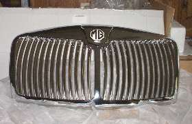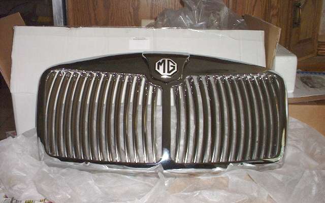 Apparently there is a slight conspiracy afoot. Tonight I attended a Natter 'n' Noggin with our local club members and was presented with a couple of gift boxes wrapped in nice red paper with ribbons. Inside the smaller box were some new chrome trim bits, cowl vents, headlight and parking light rings, "MG" emblem for the boot lid, license lamp cover, and a new fuel cap. The larger box contained, TA-DA, a new chrome grill from Moss Motors. Several friends and club members had gotten together to pool resources. When Moss Motors heard about this they promptly donated the new grille to the cause. Wow! Here's hoping it fits in place of the older one and doesn't set the project back for rework time on the body nose. .... (10 June 08)