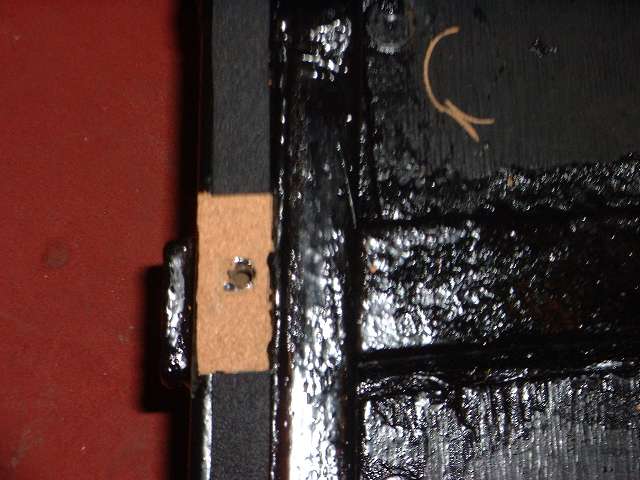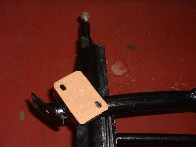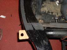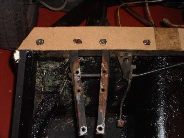 Cork pads on front frame extension (4 bolts), top of goal post (9 bolts), ahead of the A-post (2 bolts), aft of the B-post (2 bolts), aft of the rear axle (2 bolts), and at rear corners (4 bolts). There are also vertical cork strips on the sizes of the goalpost, to be glued to the front flange of the frame closure plate (4 bolts each side, not pictured). Total 31 bolts. Notice in center photo above there is a touch of white at the left side. This is (coincidentally) at the top of the frame side cover plate. The wide body flange sitting on the rubber seal stops a wee bit short of the goal post at this point. It is a good idea to close this small gap with caulking (which can be applied from inside after the body is installed).