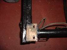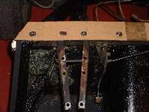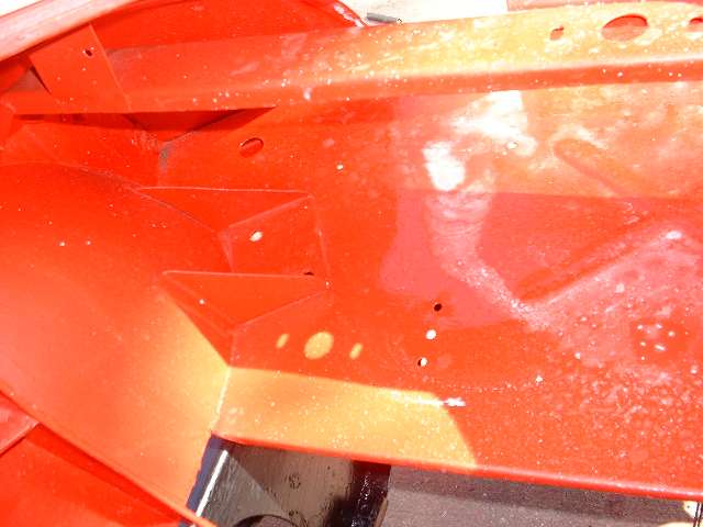 The following six photos show body mounting points correspond to the same six locations on the frame shown above. Front frame extension (4 bolts), top of goal post (9 bolts), ahead of the A-post (2 bolts), aft of the B-post (2 bolts), aft of the rear axle (2 bolts), and at rear corners (4 bolts), total 23 bolts.