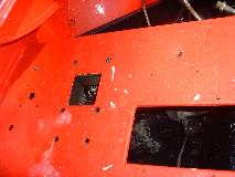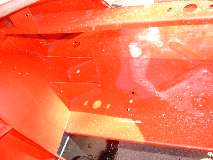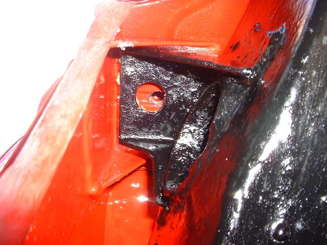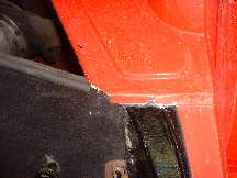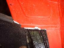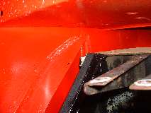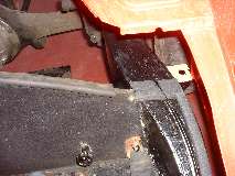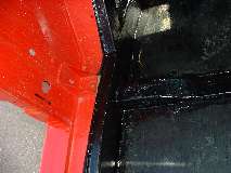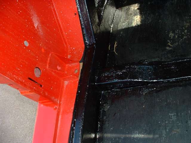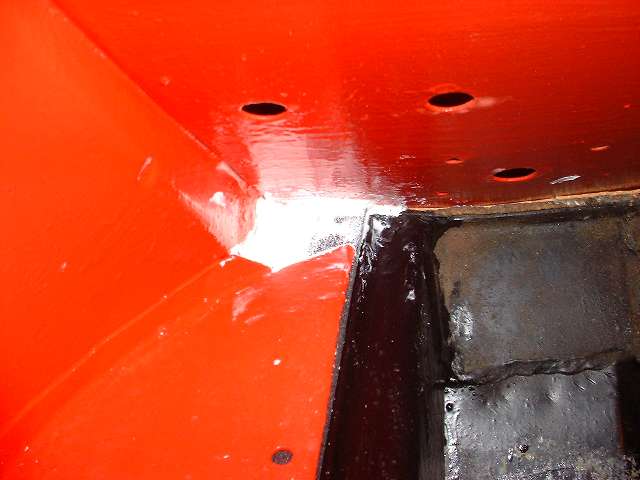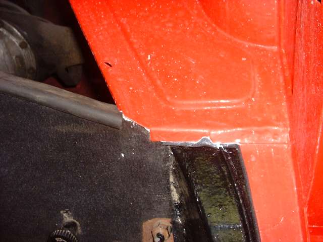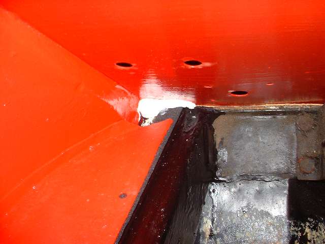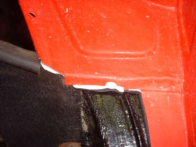 Photos below show the cockpit front corner seal area where the body flange stops short of the heater shelf before caulking, after caulking and set down, and after bolting tight and additional finish caulking. When the caulking dries I will probably hit it with a touch of red paint to reduce the visual impact, in case anyone might ever look under the dash.