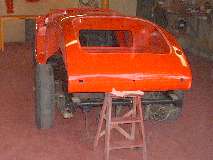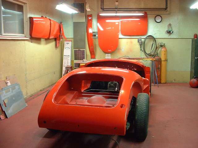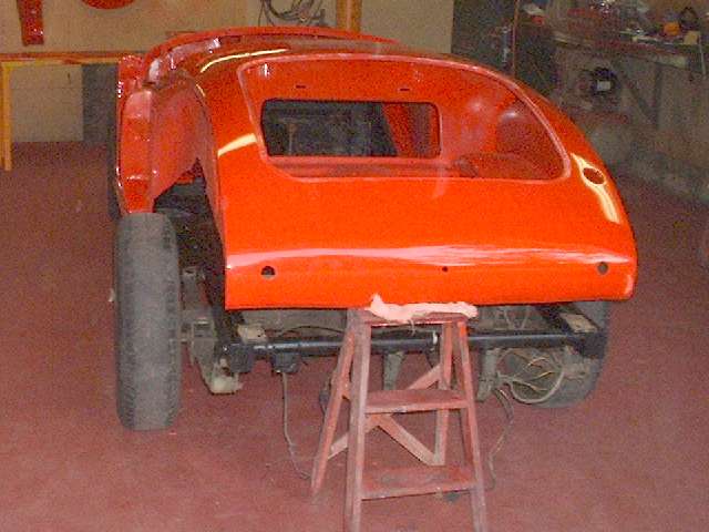 Notice the foam rubber seal running the length of the cockpit along the side rail. At the rear plywood bulkhead there is additional rubber seal installed across the frame side rail. It will also get some caulking on top of the rubber seal at this point. This is much easier to caulk while the body is still loose and can be lifted slightly for access, then set the body down on the caulking. The point of interest here is the front of the rear body shelf, actually the front edges of the trunk floor assembly, at either side of the battery cover opening. I had to learn the hard way that if this point is not sealed, when you drive in heavy rain copious amounts of water thrown up by the rear tires can run down the frame here to soak the cockpit carpeting. This is a real bear for access from behind and underneath after the car is completely assembled. I did this once by putting a short piece of plastic tubing over the nozzle end of a caulking gun. .... (17 June 08)