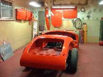 The final chore before "lift-on" was to touch up some of the cork packing (1/8" thick) on top of the frame goal post and other smaller pads on the frame where the body mates up. Then I ran 1/4-inch thick x 3/4-inch wide closed cell foam rubber adhesive seal strip for five feet down each side of the frame from the goal post to rear plywood bulkhead (and a couple inches farther). All ready now to set the body on first thing tomorrow.