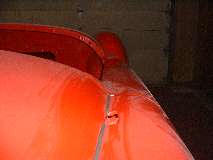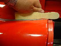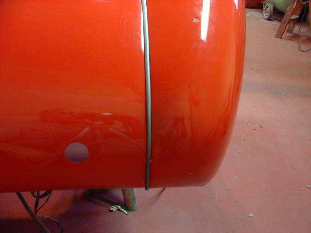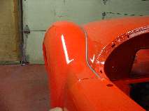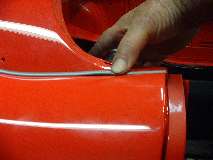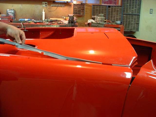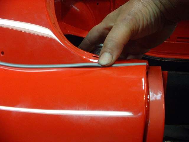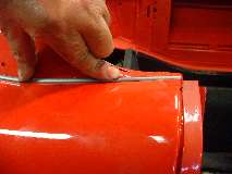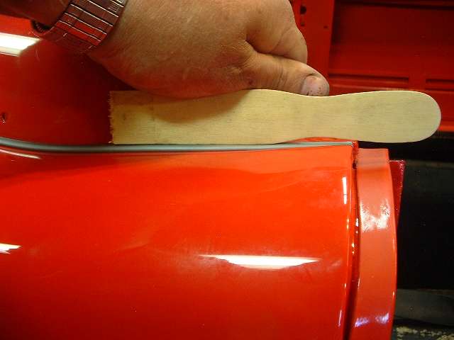 When the gap is right, and the top of the fender is near flush with top of door, tighten the first bolt while pressing the piping down tightly on paint work. Then go on with each bolt in sequence working with one or two bolts at a time while you keep an eye on the piping a couple of bolts farther on. It may help sometimes to slip a couple of wood shims (paint mixing sticks) in the gap ahead to keep the parts from pinching the piping web before you want it to. If you tighten a bolt without pressing the piping down you may find a camel hump in the piping above the bolt (first photo above). Not to worry, just loosen the bolt, press the piping down, and tighten again. If the hump is stubborn you may be making the bolt too tight. You have about a dozen large bolts holding a 10 to 20 pound fender, so the greatest load for the bolts is to hold the piping in place. Each bolt should have the large flat washer and a lock washer, and be tight enough not to rattle loose when driving.
