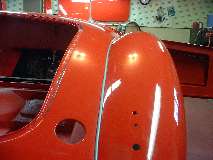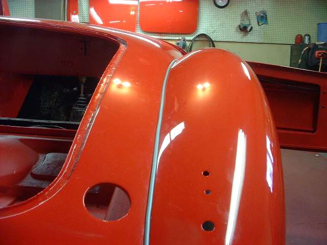 By now installing doors and fenders is no big deal. This has all been assembled and aligned before in the process of doing body work and primer paint, so now basically bolt it together with piping and a little care in alignment. As usual, install the doors first. It's a cake walk, as long as you haven't mixed up the hinges. Just get the hinges and latches working, and don't worry too much about lateral alignment until the finders are in place. The latch striker plate may have to be re-installed a couple of times, as the shut face plate cannot be finally secured until after the rear fender is properly aligned and tightened in place.
