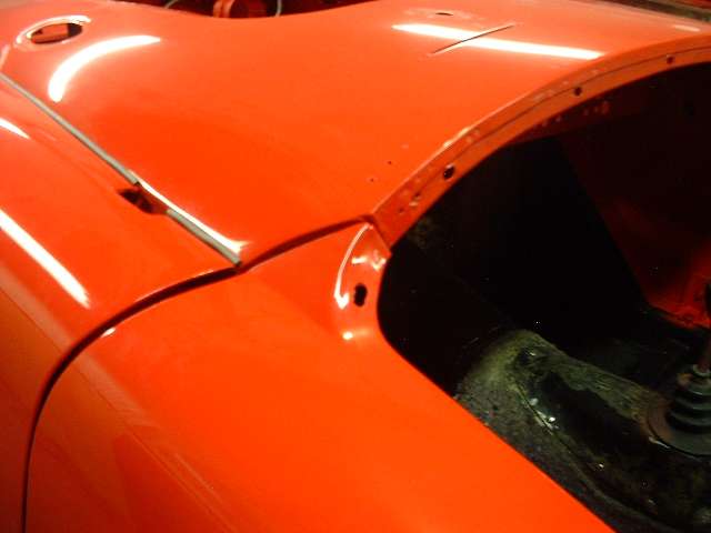 Front fenders are a little more challenging, perhaps depending on how unmolested and original they may be, or in my case, how many times they have been molested and reworked. I install a couple of the upper bolts to hang it loosely, then install the three 1/4 inch bolts fixing the lower edge to the body sill. In my case this requires a bit of a boost to align the lower edge, but once attached there it helps lift the mass of the fender which is nice when installing the rest of the upper bolts. The upper bolts and piping go along much the same as for the rear fender, starting near the door to get the top edge flush and the door gap looking nice. Then work forward one or two bolts at a time pressing the piping into place as the bolts are tightened. You may want to snug up the front bolt temporarily early on to assure that the bottom front edge will be flush with the body at the bumper line.