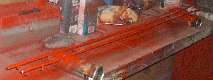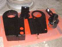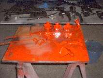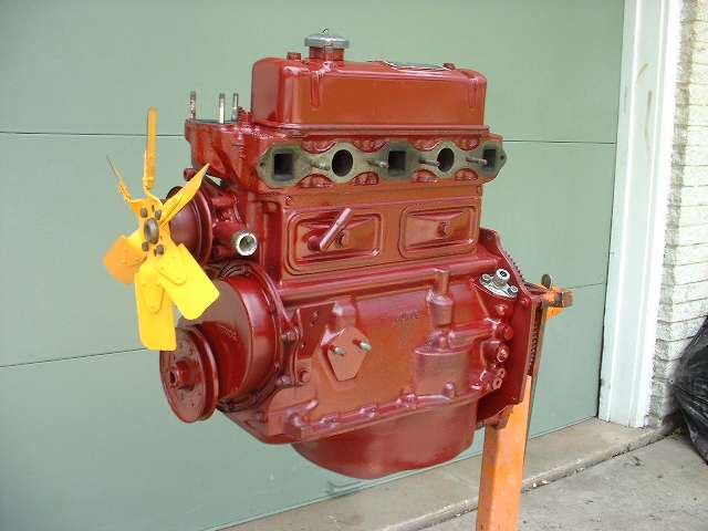 Where has the time gone? I can't believe I didn't assemble anything on the car today. I started to clean and paint a few small parts, and the whole day just slipped away. The two big black parts on the front table (above center) are the metal fan shroud, circa 1997. I noticed the starting handle has "MOWOG" stamped on the side of the cross leg. Good news is, this is most of the small red and black bits remaining, and I did get the heater reassembled after painting (with a few finger prints to be painted over tomorrow). .... (24 June 08)