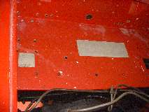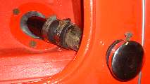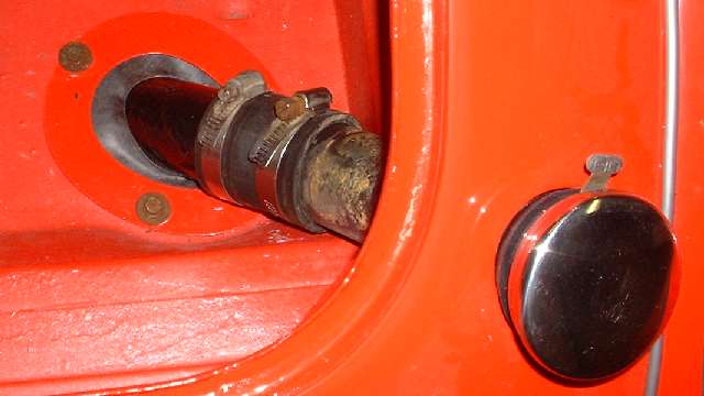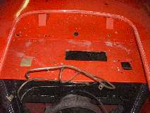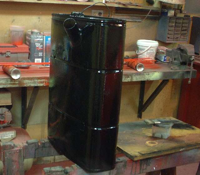 Photo above right shows the fuel tank installed with new rubber packing (and old steel band straps still dirty). Just before painting the tank I applied air pressure in it to push out a bit of a dent in the bottom side. I put the air blow nozzle on the fuel outlet fitting and held my hand over the filler pipe, letting the pressure build until I could no longer hold it with my hand, guessing it may have been 15 or 20 psi peak. Not only did it remove most of the bottom dent, but it also bulged out the ends of the tank almost half an inch, so I may have a wee bit more fuel capacity now.