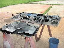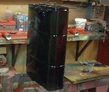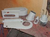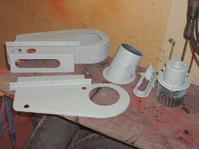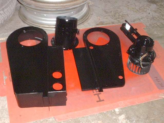 Many things are flying right along with progression of final assembly. Today I also disassembled the heater to clean and paint the housing. When I scrubbed it with gasoline some of the paint came off. So I scrubbed it with lacquer thinner and all of the paint came off (at least on the outside). I guess I was using cheap lacquer (and maybe no primer) for this 22 years ago, so now I get to do it right. All cleaned up and sprayed with primer today, to be black tomorrow (below left).