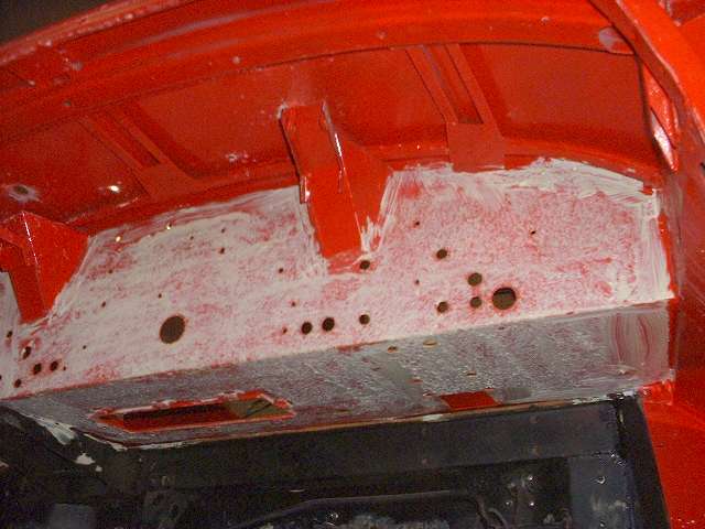 Today I got after the dash panel first, wet sand, prime again, wet sand again lightly, and paint red a couple of coats. Also apply another coat of red to the lower body trim strips, and a second coat of Chassis Saver to the fuel tank, all looking good.