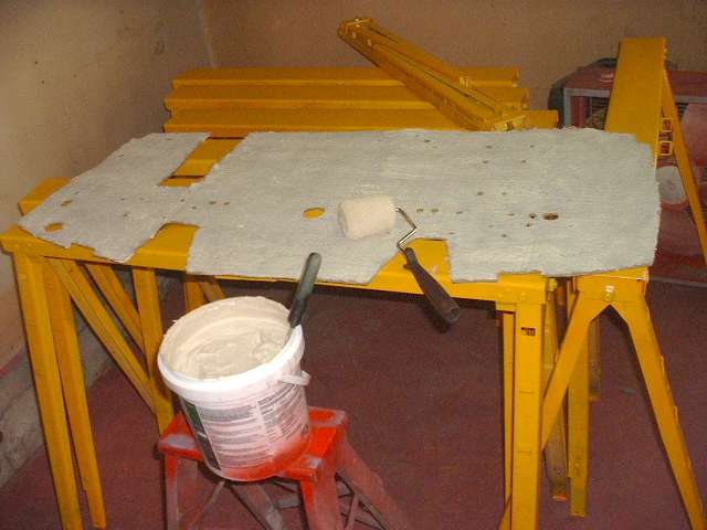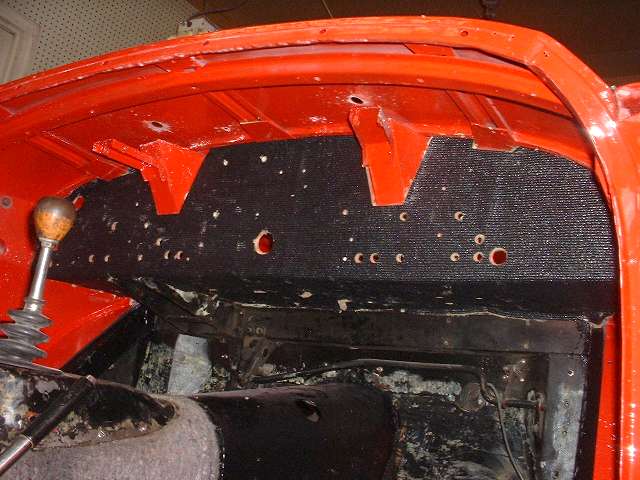 I opened the fresh gallon of carpet adhesive ($14 from Home Depot) and had at it with a 3-inch paint roller and a cut down 1-inch paint brush for the tight corners. It didn't take long to slobber goo under the heater shelf and behind the bulkhead panel. Then I set the pad down with the felt side up and slobbered more adhesive on that. It was nice that a friend dropped by to lend a hand with the bulky pad, moving it into place and sticking it on the body panels. Most of the pre-cut holes lined up okay (we checked that first) including little square cut-outs for the heater mount cage nuts. The goo stayed sloppy just long enough to push the pad around a little for final alignment, and there was no risk of it coming loose during handling. Pictures below left and center show top side of the heater shelf before and after slicing out the pad around the heater opening.