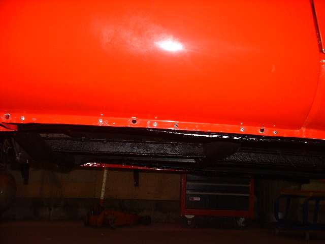 Then it was time to install the sill bottom finisher strips, where I have another trick up my sleeve. For body assembly work I have been using 1/4-inch bolts in the fender bottom flanges. Some of the holes were drilled while the parts were clamped in final position, which is why the holes are round and not slotted as original. One problem here is that the space inside the narrow flanges of the finisher strip is only about 1/4-inch wide (or a little less), and the head of a #10 fillister head or cheese head screw is about 5/16-inch wide. I have never figured out how to make the finisher strip fit over the screw heads, not now nor during past restoration work. So I pulled the same trick I have before. I drilled some 1/8-inch holes and installed pop rivets, then removed the bolts before installing the finisher strips. It works fine, and no one has ever noticed this before. Most of these pop rivets went in the same holes in the fender flanges that I have used already twice in the past, only needing to drill through the new inner sills to match. When it comes to later disassembly, drilling out pop rivets may be easier than removing rusted bolts.