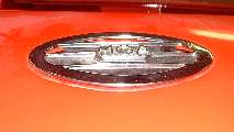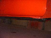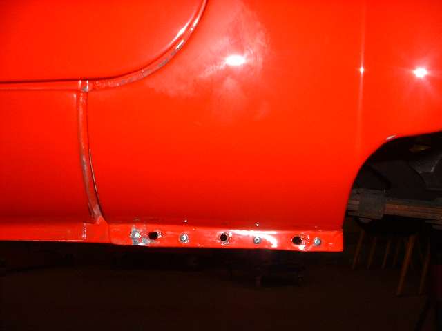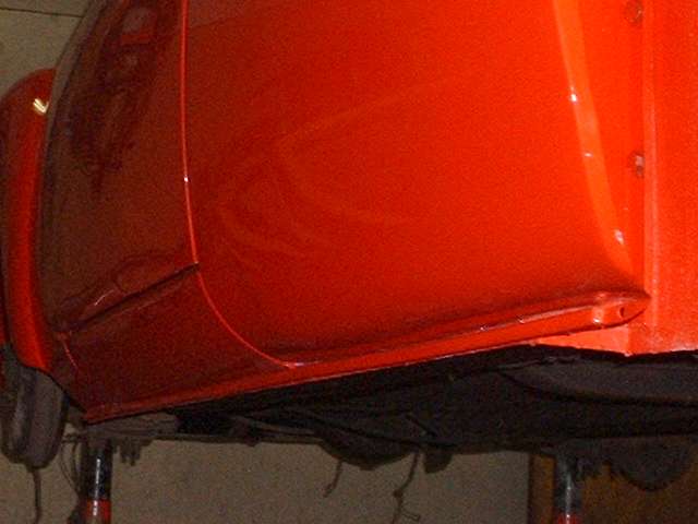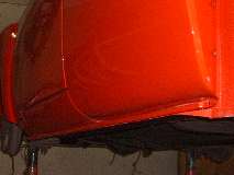 Here is the right side finisher strip installed, using the same special #10 T-bolts the came with the purchase 10 years ago (5 studs each side). Notice the back end of the finisher strip is very near the back of the rear fender dogleg, while the front end of the strip stops short leaving one hole exposed in the front fender. That hole is for the bottom bolt of the splash panel that may be installed or removed any time without touching the trim strip. .... (23 June 08)