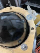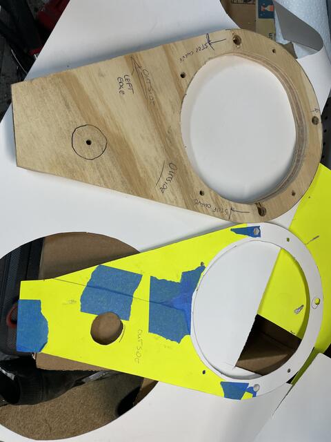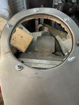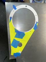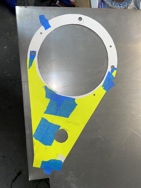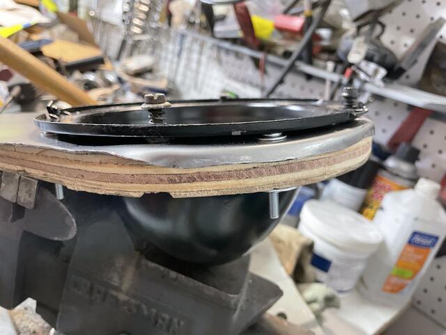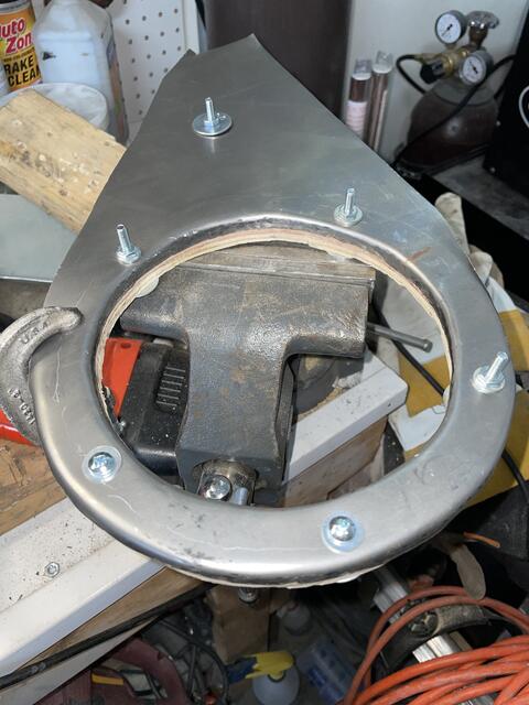 Taking advantage of the flat area here I made a cardboard template whose edge followed the edge between flat and the curve of the front part of the fender. I used the fender from the '59 (which is in very nice shape in this area) to create the template. Transferred that to a 1" thick plywood I had laying around and made a buck. Cut a piece of sheet metal just larger than the template. Then attached that to the buck using the holes that would mount the bucket and clearance holes for the adjusters. I added one though the center of the turn signal lamp to keep the whole thing together while I hammered. It's important that the metal be held tightly to the buck as it will want to lift away from it as you hammer over the edges. I typically make a piece to go over the top to clamp it in place, but the need to make curved edges on the outside and the inside of the bucket hole pushed me to try it with screws and washers. It worked pretty well and only pulled up a little in two spots. Once I weld it in place those should be easily fixed.
