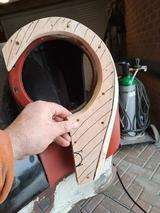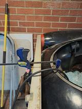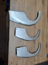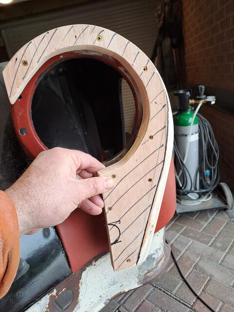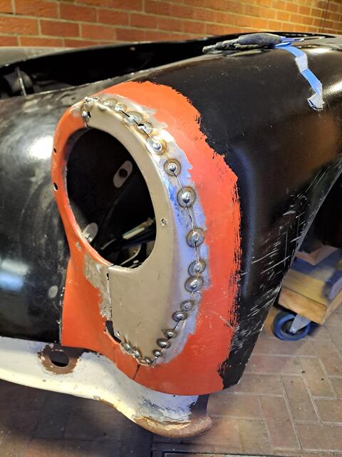 I should have a go at fabricating a proper repair panel to bring everything back into line. Having never done anything like this before, I attempted to make a ply wood buck which would incorporate half of the headlamp ring, retaining the flange joint above the side lamp. Trying to recreate the compound radius return edge where the bad metal was. This was far from an easy task, trying to judge the radius edge largely by eye and sanding the curve on the buck. After no less than 4 failed attempts, I finally got a repair section tacked in place. Pretty pleased and relieved with the outcome so far.