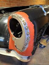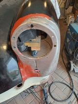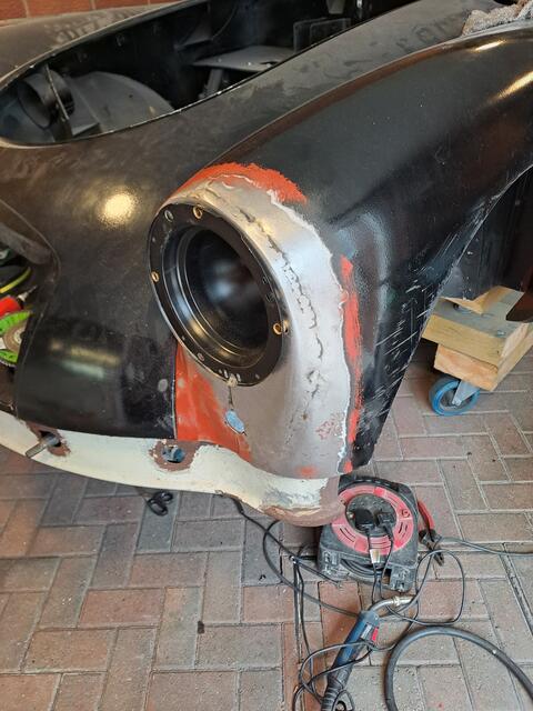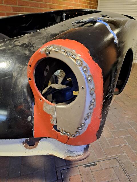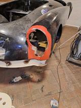 1959 MGA 1600. Decided to tackle the front left hand wing (fender) headlamp surround area. This area has obviously had repairs by a previous owner. It appears that a new headlight ring had been welded in but with some dubious metal to the left hand side which I initially thought I could patch. This just didn't work out, like trying to weld tinfoil and was just making matters worse.