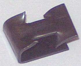 Four of these clips are installed around the back edge of the center badge cover for the steering wheel. The flat side of the clip goes inboard. The barbed leg goes on the OD of the center cover rear rim. Two of the sharp barbs dig into the flange of the cover so the clips will not come off. When the cover is inserted into the steering wheel center hub, the outward pointing barbs slide down and dig into the ID of the steering wheel hub for a good grip so the cover will not fall out.