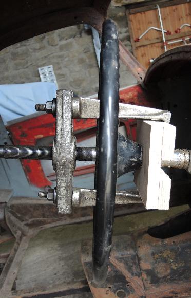 "Steering wheel on hard, reluctant to use a big hammer, but did have a decent gear puller, two small pieces of ¾” plywood and job so easy with no risk to steering wheel, face or chest"! -- John