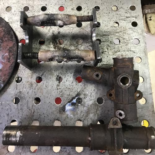 The common advice was to cut the three welds and "knock the end off", easier said than done, it seems. The press fit explains why they don't leak at the joins. Being the reverse of a problem that I could solve with my press, I had to improvise. The attached picture shows a turnbuckle, savaged from some house modifications that I shortened. I milled some slots into 6mm plates with appropriate cut-outs to locate the threaded rods and stop them spinning. It assembled as planned. I had to resort to a jemmy bar to get enough leverage, but I succeeded without damaging the parts. Reversing the procedure, as the manual says, can await another day".