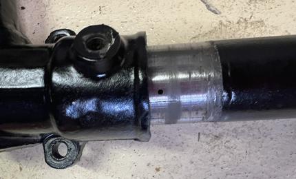 "The other steering rack issue ... relates to converting a LHD rack by exchanging the pinion 'knuckle'. The attached picture (pushrod rack) shows a small hole aligned with the oiling nipple for the LHD housing. The RHD pinion oil nipple is on the other side, so a new hole needs to be drilled after pressing the two parts together".