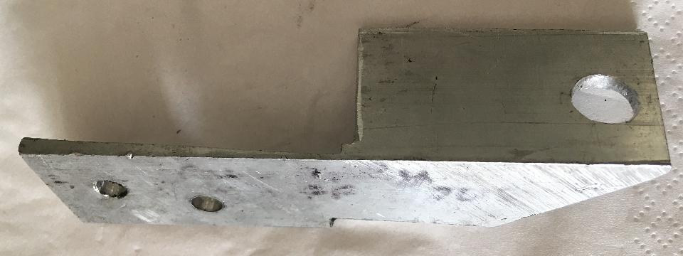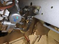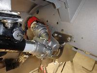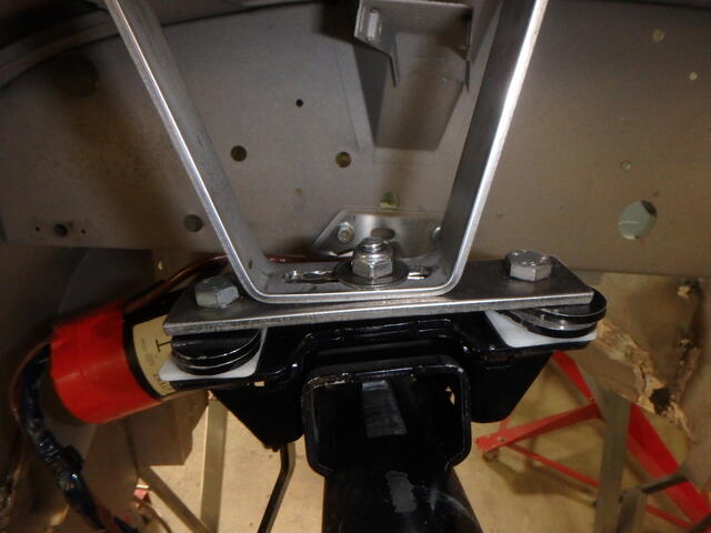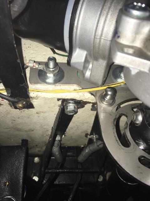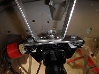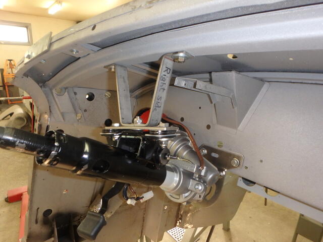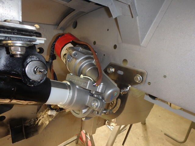 A bracket is then mounted on the inner firewall to the lower bolts of the bracket for the master cylinder. This is used to mount and stabilize the bottom of the EPS motor. Adjustment to individual cars is achieved here by cutting the bolt and reinforcing sleeve to length between the bracket and the threaded motor mounting lugs. The bracket is slotted to take up dimensional variations and center the Toyota knuckle in the bracket and to allow the motor to be clocked out of the way.