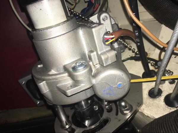"Here’s a new electric power steering. Basis is the steering column from a Toyota Yaris 2004. It’s a unit that has a fail-safe mode which is stimulated by current to the VSS pin on the ECU, so it works without a VSS sensor. The unit is a bolt in replacement for the standard column, and no welding or drilling is required. Supplier is Gio Delicio in Germany. The old column is removed, and only the lower clamp and steering wheel are re-used. The upper mount is replaced by a welded stainless frame that screws to the original body mount.
