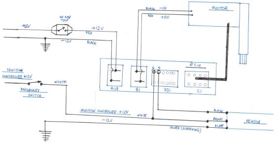 Another wiring digram, compliments of Colyn Firth in South Yorkshire, UK. This one includes both the speed sensor and manually variable assist control, but for pre-ABS cars. This may not be correct for steering units from cars originlly equiped with ABS.