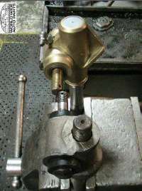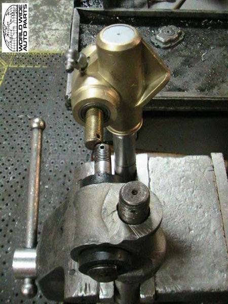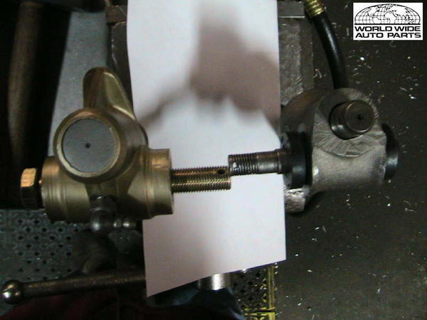 Peter wrote: "2 MGB kingpins. We turned one on the upper bearing diameter so it would fit snugly into the brass MGA trunion, and we installed a MGB trunion on the other. Placed both in a vise ensuring they are square to each other. Inserted the sleeve and bolt into the MGA trunion and the OE rubber sleeved bushings and bolt into the MGB trunion. As you can see, there is a difference of roughly half a bolt diameter where the MGA is farther outboard than the MGB".