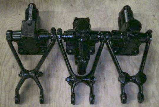 "Here is a picture showing, from left to right, standard MGA shock, standard MGB shock, and MGB shock body reversed with MGB arms flipped to fit an MGA.