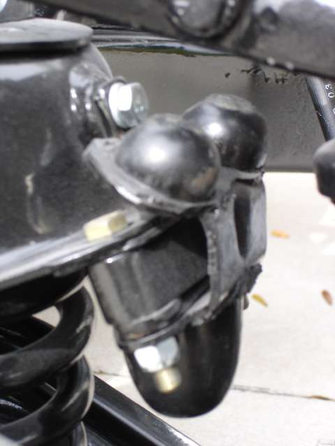 Here is a picture of the MGB bump stop installed on the MGA. Notice that the aluminum spacer block has been relocated to the underside of the frame flange, and the addition of a thin plate between the frame flange and spacer block.