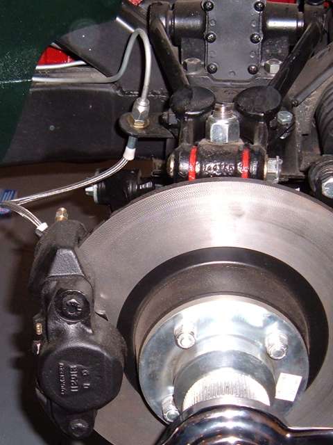 We used MGB brake hoses. In order to use these front hoses with the B calipers, we bolted them into the calipers and the opposite end was installed in the MGA brake hose location with washers installed TIGHT on the top and bottom so we did not weld the holes (although its not a bad idea to just weld one thick washer to this location!) The MGB hoses need a different fitting as well. We altered the ends of the MGA pipes to fit the female ends.