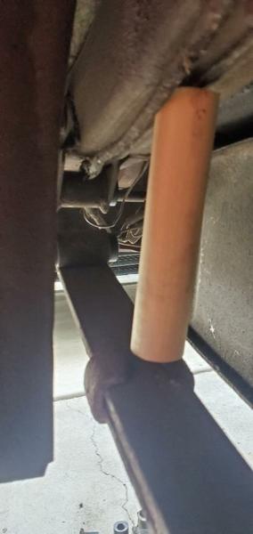 11. While pushing the shackle pins into the eyelets with the bushings in place, you need to alternately squeeze the bushings and push the shackle pins in. Because the wood holds the leaf away from the upper eyelet - the distance between the two eyelets will only need a slight outward adjustment with the crow bar. Without the wood, its hard to even get the crow bar between the eyelets. Push the long end of the crow bar between the two eyelets, and put the end of the crow bar against the upper frame a few inches beyond the eyelets. Push the eyelets slightly apart to match the size of the shackles. Once started, the shackle will hold the distance, and the crowbar may not be needed.