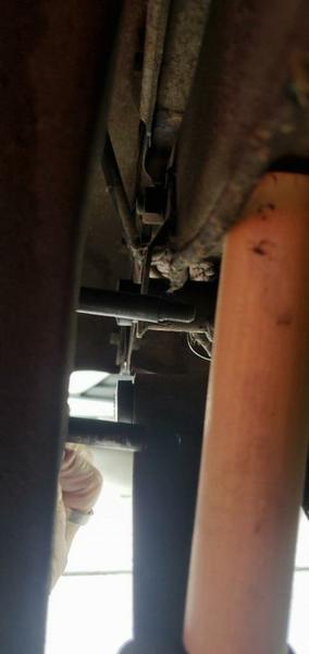 5. From the rear, loosen/remove both nuts on the shackle. Use the 9/16th socketing wrench. Don't lose the nuts and lockwashers.