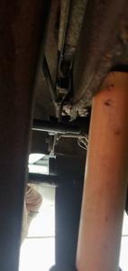 6. Use the crow bar, screwdriver, and/or hammer to pull the shackle pins out of the eyelets. The wedged piece of wood will make this easier as the tendency would be for the leaf spring to push up and close the gap.