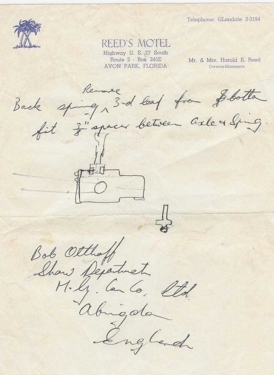 It was penned by Bob Orthoff, written on stationary from a hotel in Avon Park, Florida (USA), just down the road from Sebring Florida. It is instruction for the desired modification of the leaf spring for a race car.