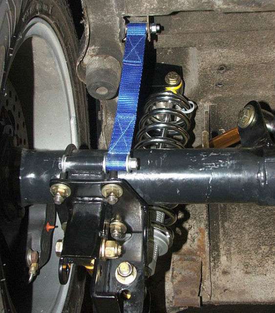Rebound straps on the rear axle serve to limit downward motion of the axle. This is intended to catch the axle when the car goes airborne, or when it may encounter a sudden steering transition that causes excess body roll. The axle must not be allowed to drop so low as to hit end of travel of the shock absorbers or to land on the exhaust pipe.
