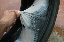 New tires often have stickers inside, which may be either paper or Mylar. Being a flat printed piece, the stickers almost never conform to the curved contour inside the tire, so the stickers most often will curl up at the edges or wrinkle in the middle. These curls and wrinkles will also crease the inner tube to cause leak failures. Never leave any manufacturer's stickers inside the tire if you will be using tubes.