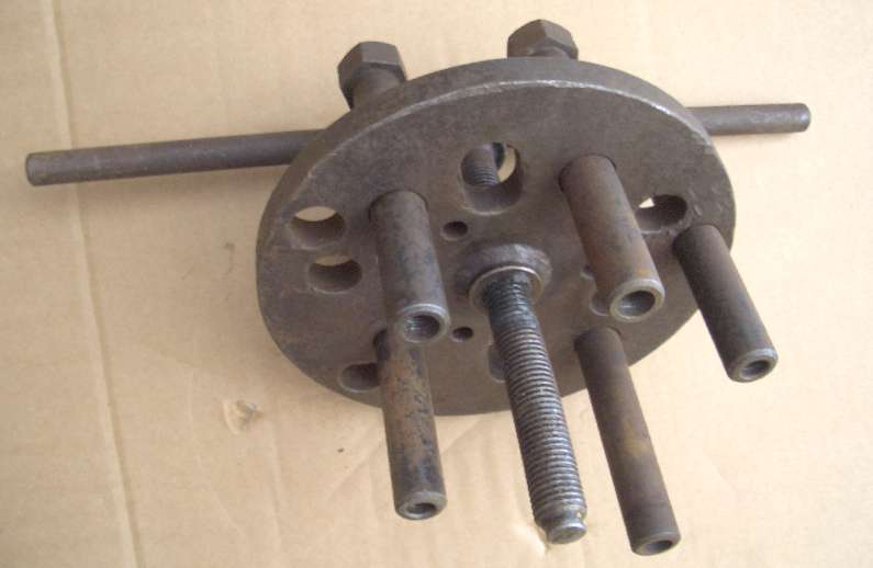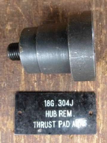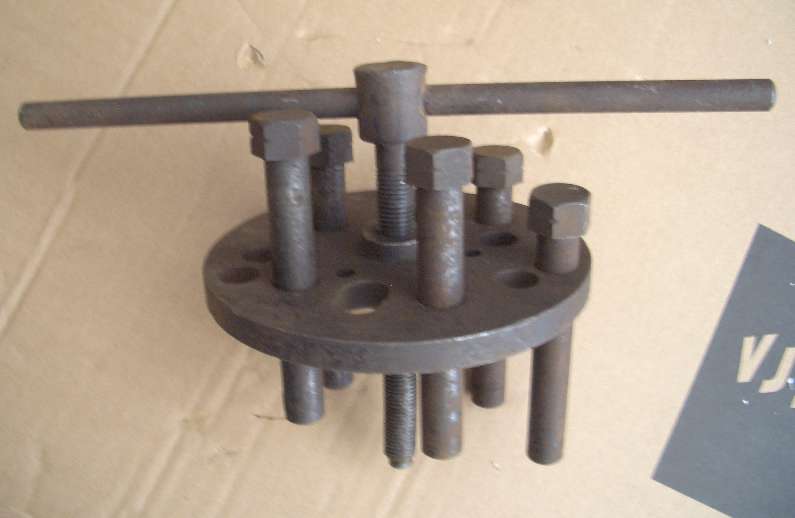 The plate in combination with two bolts and plug will remove the front and rear hubs of the M.G. 'MGA' with pressed steel wheels. When used with different bolt adapters it can be used on a variety of BMC models.