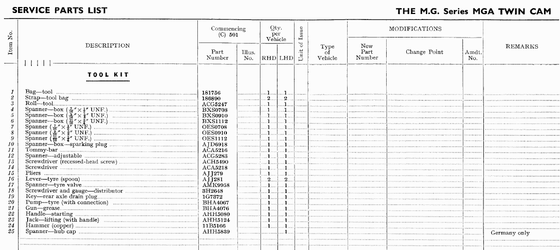 BMC part number AHH5835, is the Tool Kit for the MGA Twin Cam. Abingdon King Dick drawing no. A5966 shows some tools that can be used for the Twin Cam, but is not a true representation of the parts actually in the tool kit. In particular, the "Screwdriver and gauge - distributor" (for setting contact points) which was part of the tool kit is not in this drawing. Alao the tappet feeler gauge shown as 0.018" thick is incorrect thickness, and is not part of the traveling tool kit. Note the date of the drawing is 6-3-58 (6th of March, 1958), which is some time before the first Twin Cam was delivered from the factory. By the time the first cars were delivered the tappet clearance specification had been reduced.