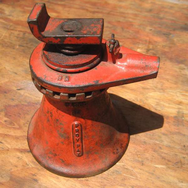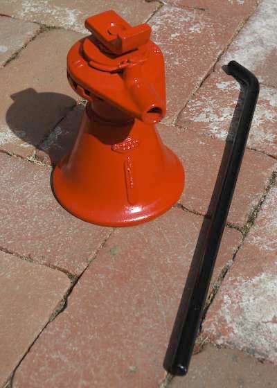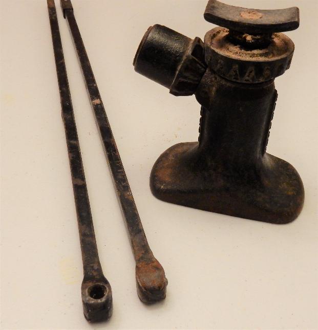At right is a 6-inch SHELLEY screw jack. This model has a "bow tie" base similar to the King Dick jack, but with more rounded corners. Period tool from a swap meet, not original equipment for any MGA.