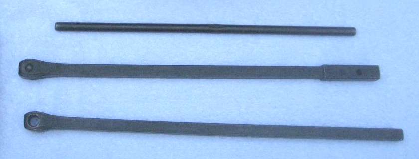Below is another picture of a handle that came with a Shelley LJ225 jack (same as above). The center piece (below) has a fat square driving end with rounded sides to allow swiveling like a universal joint, and a spring loaded ball detent. The opposite end has a square socket coupling with small hole in the side. The second extension piece (bottom below) has a mating small square coupling end with a spring loaded ball detent that can engage the hole in the other piece to hold them together. Opposite end has the large eye and cross hole. This accepts the round cross bar (top piece below). The two extension pieces are each 14 inches long, while the manual driving cross bar is 12 inches long. Thanks to Curt Arndt in Carlsbad, CA, for this picture.