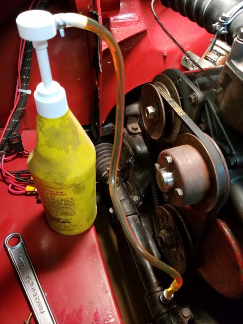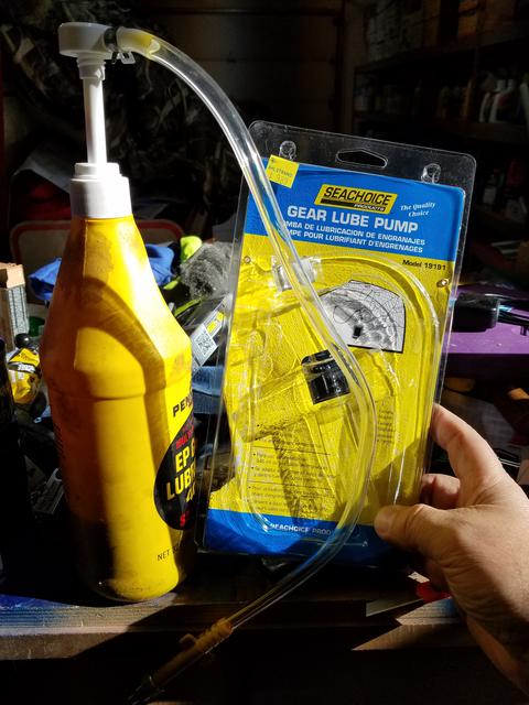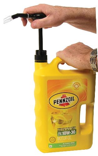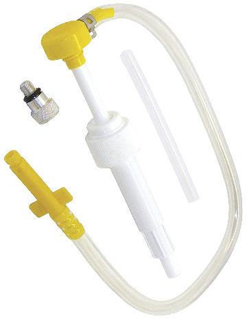 I rather like this one, adaptable to short quart oil bottle, tall quart gear lube bottle, one gallon jug, and with a long stroke pump. It might require two hands to hold the bottle and work the pump as your third hand holds the spigot in the fill port.