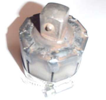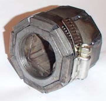 The black tool shown immediately above is a 1/2" drive forged steel socket intended to be used on the front drive hubs of some small trucks and sport utility vehicles. It has four square drive keys inside which will catch 4 sides of the 8 sided nut (shown on the right). This appears to be a little loose and not an ideal fit, but because it is a strong forged steel part it seems to work quite well. It works like a flank drive socket, bearing on the flat sides of the nut a little away from the sharp corners. A club friend has recently used this socket with an air impact wrench to R & R