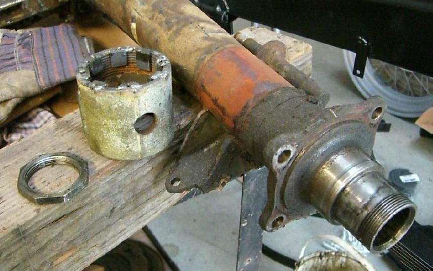 "The new socket was useless - it just burred the drive dogs and slipped off the nut first try (see photo). No matter how many more times I tried I could not budge the nut. .... While the OTC socket is 1 61/64" between the drive dogs it is not meant for this job (made to fit in slots in Bronco hubs, etc). It is a fabricated part (the Ampro brand may be forged but the OTC is not) and the dogs don't appear to be hardened, and it is hard to keep aligned and exert the required torque. I would not recommend this tool for MGA rear hub nuts!"