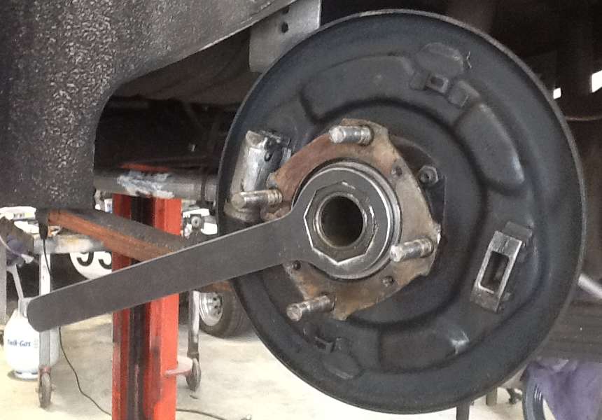 This flat wrench recently appeared on eBay with opening bid of only $4.99. I'm just a little skeptical about this one, because the octagonal nut is recessed slightly inside of the hub. For this tool to work I'm sure that at the very least you would have to push the hub inward toward the brake backing plate to allow the large nut to be exposed for a clear grip. Since the wheel bearing is supposed to be a very snug fit inside the rotating hub (at least a light press fit), the difficulty of having to push the hub back on the bearing leaves me wondering about the setback distance and possible seal damage. I had a short correspondence with the seller who insists that it works well (some satisfied customers as well as his own use). If anyone should happen to try one of these tools, please send me a short review.